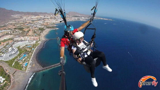 A spectacular aerial perspective of the coast of Adeje, Tenerife, captured from a paragliding flight. Enjoy the unique fusion between paragliding adventure and coastal beauty