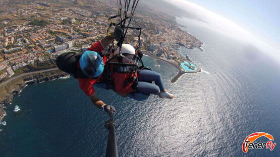 In this exciting image, a paraglider takes to the skies with Tenerfly, exploring the skies over the picturesque coast of Puerto de la Cruz in Tenerife. The contrast between the blue of the Atlantic Ocean and the tourist city with Lake Martianez as a background