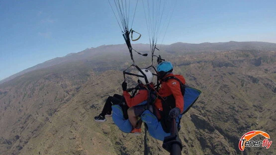 A moment of romance and excitement: couple enjoying paragliding together over the impressive rocky mountain of El Conde, Tenerife. A memory shared in the skies of this magical island."