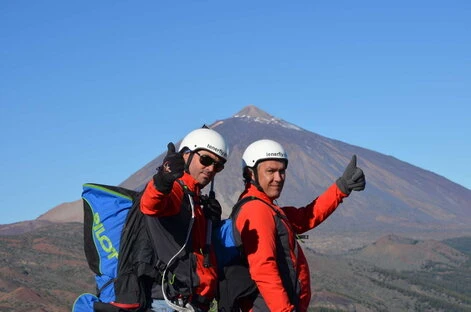 This striking image encapsulates the unique experience of flying over Izaña with the majestic Teide as a backdrop. The paraglider floats in the air, immersed in the serenity of the skies, while the imposing Teide, the highest mountain in Spain, rises majestically on the horizon.