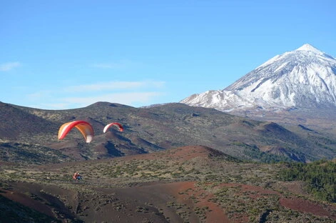 In this impressive snapshot, a paraglider rises majestically over the summit of Izaña in Tenerife, immersing himself in a unique aerial experience. The panoramic view from above reveals the spectacular topography of the summit